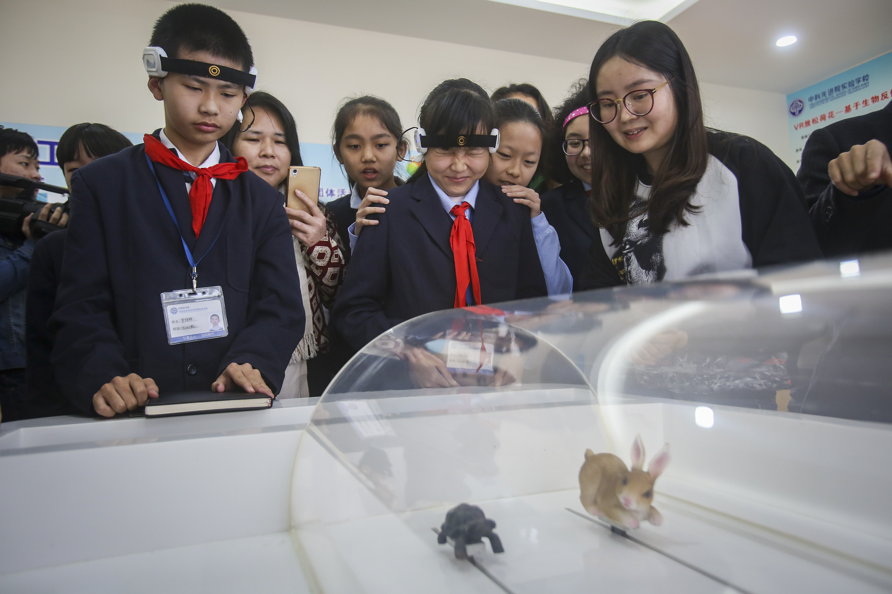 2017年2月27日,中国科学院深圳先进院实践学校,学生通过脑电波限度“龟兔竞走”以磨练专注度。 南边+ 朱洪波 拍摄