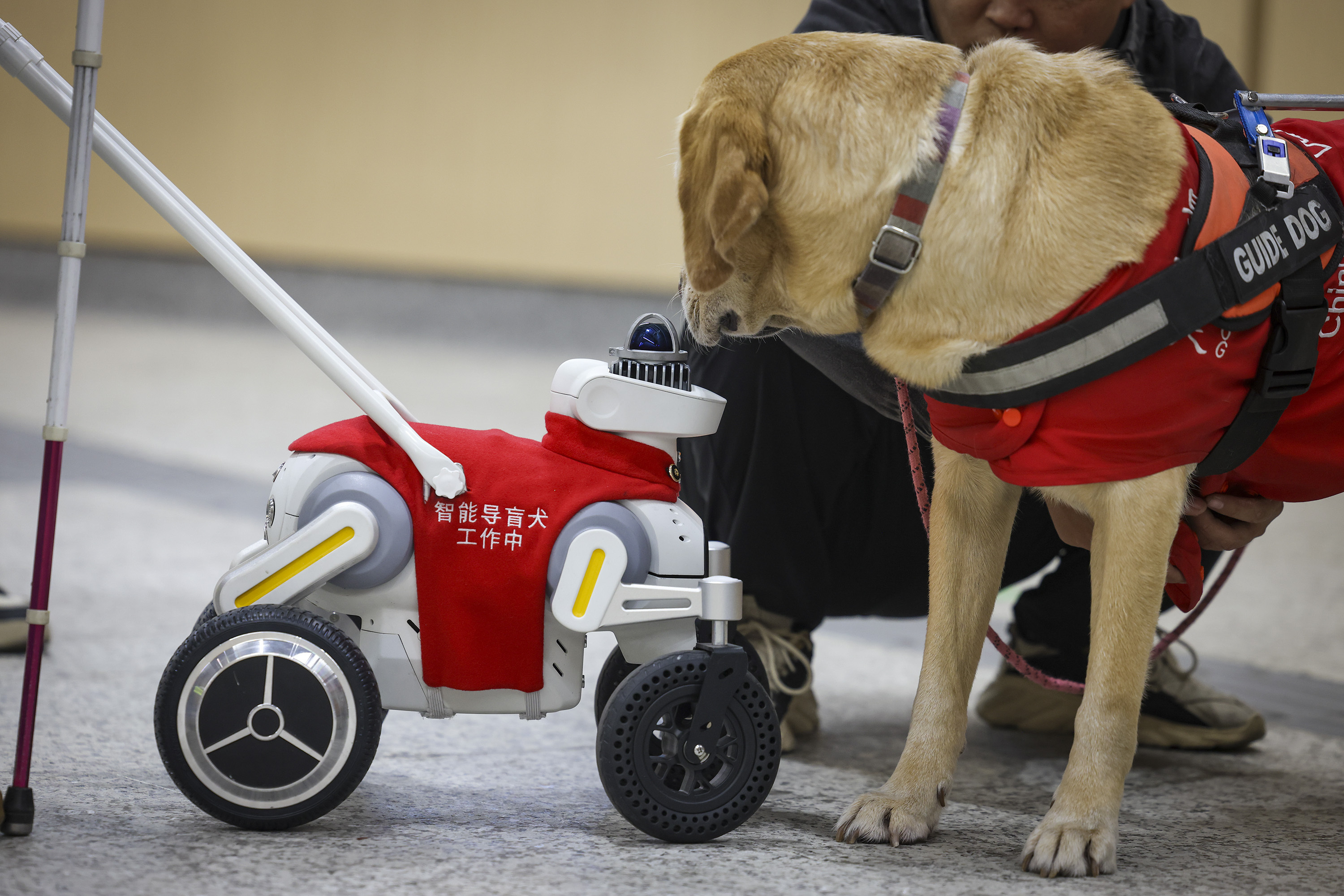 2025年12月16日,深圳地铁黄木岗站,一双视障妻子前来体验新启用的智能导盲确立,现场献技了信得过的导盲犬与智能“导盲犬”相遇。 南边+ 朱洪波 拍摄