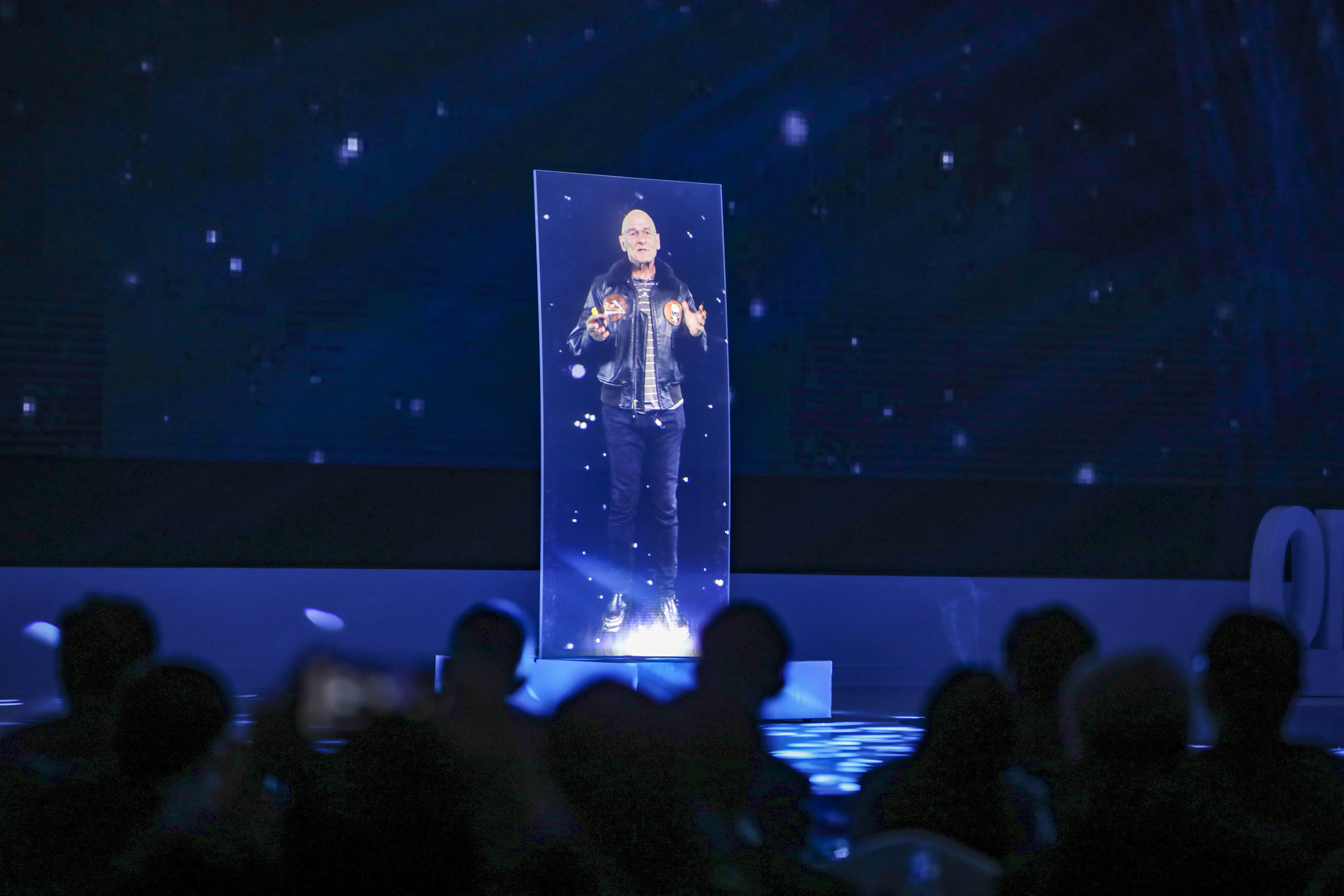 2020年11月1日,深圳寰球立异东说念主才论坛,图灵奖得主大卫·帕特森通过全息投影演讲。 南边+ 朱洪波 拍摄