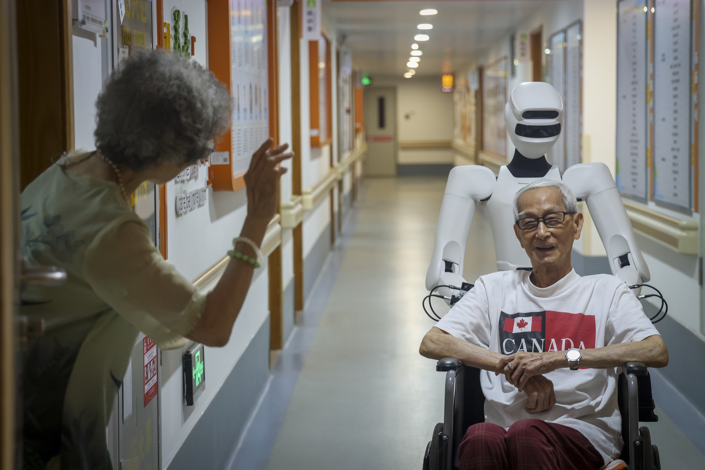 2025年8月21日,深圳市养老照料院,机器东说念主在走廊援手推送坐轮椅的老东说念主。 南边+ 朱洪波 拍摄