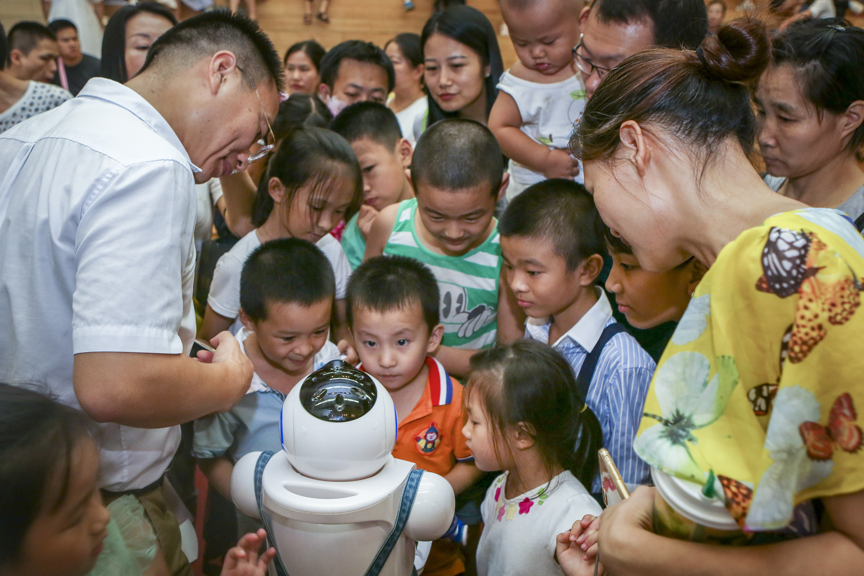 2017年7月9日,深圳中心书城,大小一又友围住机器东说念主互动。 南边+ 朱洪波 拍摄