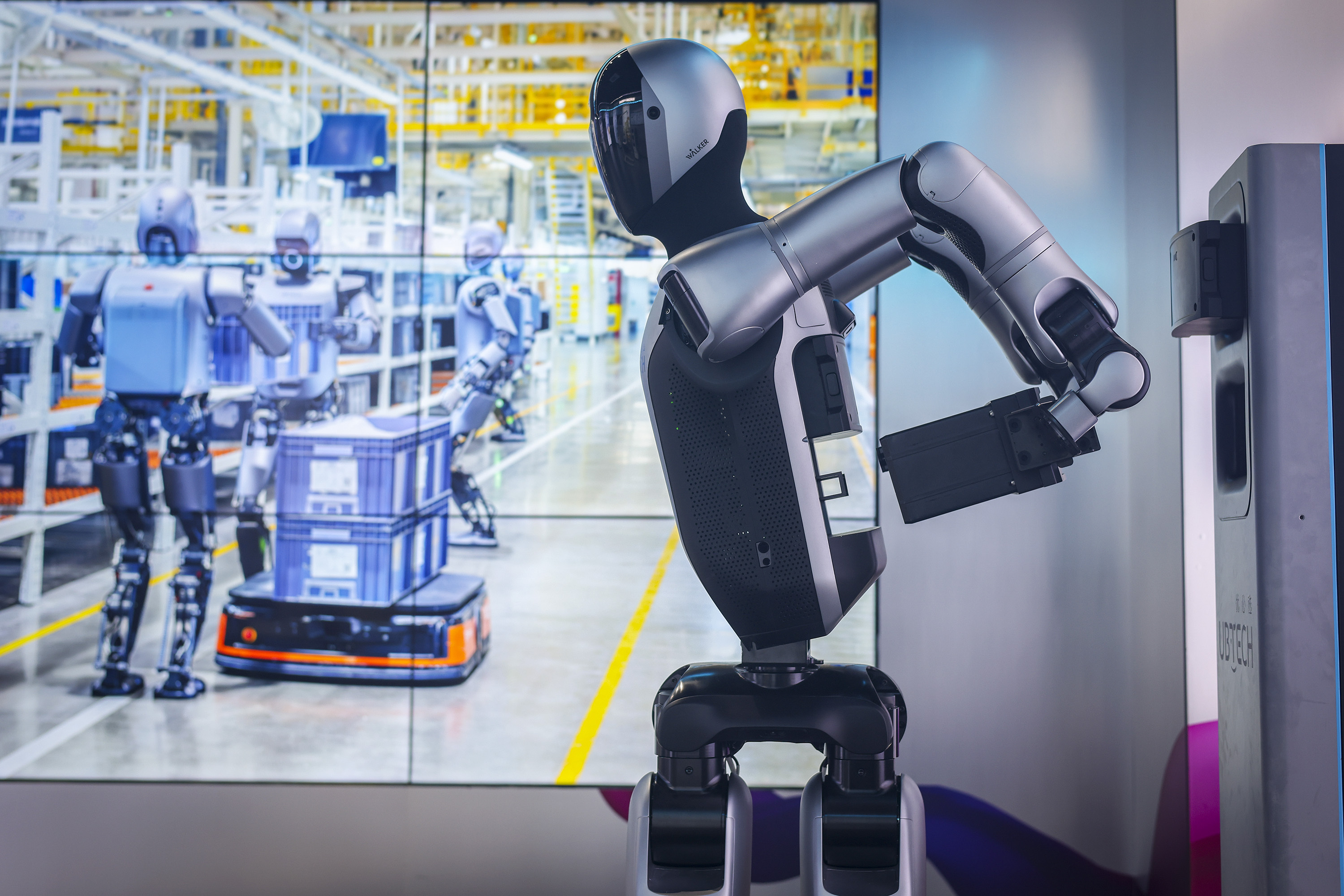 2025年11月26日,深圳优必选展厅,东说念主形机器东说念主Walker S2演示自主换电,无需东说念主工滋扰,3分钟完成,可7×24小时执续责任。 南边+ 朱洪波 拍摄