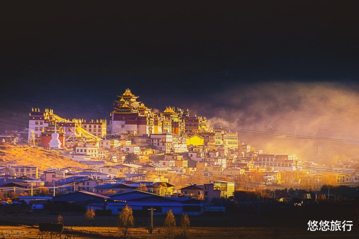 晨雾中的松赞林寺,阳光照在金顶上,醒目精明,泛着神韵。